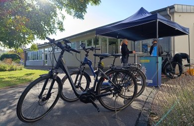 Das Landratsamt hat gegenüber der Kfz-Zulassungsstelle ein neues Angebot für Radfahrende in Betrieb genommen. Hierzu gehören insgesamt 14 Stellplätze für Fahrräder, eine Schließfachanlage mit kostenlosen Lademöglichkeiten für Fahrrad-Akkus sowie eine Servicestation für kleinere Fahrradreparaturen. Neben den Beschäftigten des Landratsamts können die Anlagen auch von der Öffentlichkeit kostenfrei genutzt werden.